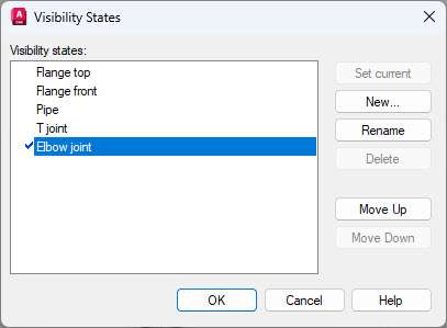 Click the โ€œNewโ€ button and add โ€œFlange frontโ€, โ€œPipeโ€, โ€œT jointโ€ and โ€œElbow jointโ€ visibility states as shown in the following image.