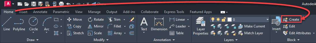 Click the โ€œInsertโ€ option from the โ€œBlockโ€ panel of the โ€œHomeโ€ tab and then select the block that we just created and place it in the drawing area.