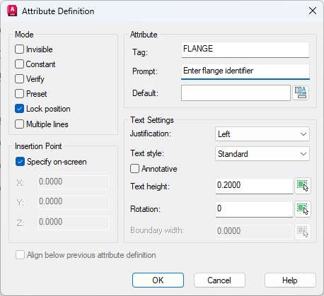 I am using 0.2 as the text height for this example, finally, your “Attribute Definition” window should look like the following image.