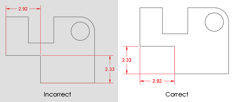 Extension lines should not directly start from the part and there should be a gap of nearly 1/16″ from the object. Extension lines should be extended nearly 1/8″ beyond dimension lines.