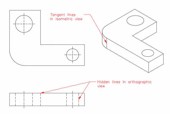 Never show hidden lines in the isometric drawing views but show the tangent lines. Show hidden lines in orthographic view.