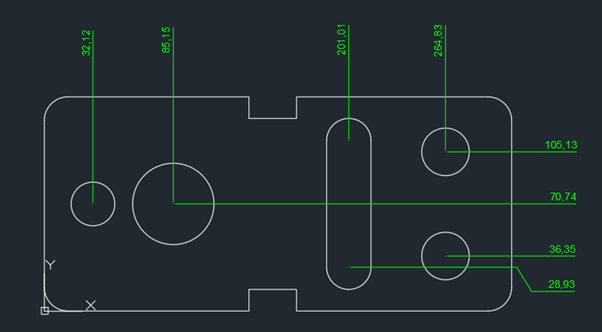 To avoid several dimensions in a drawing use Ordinate dimensioning where the location of features like a hole, slot and shaft is defined from zero point in the drawing. In this case, no arrow is required in the extension line. In the following image, the lower-left point is the origin or point zero for both horizontal and vertical direction and all other dimensions are measured with respect to that point.