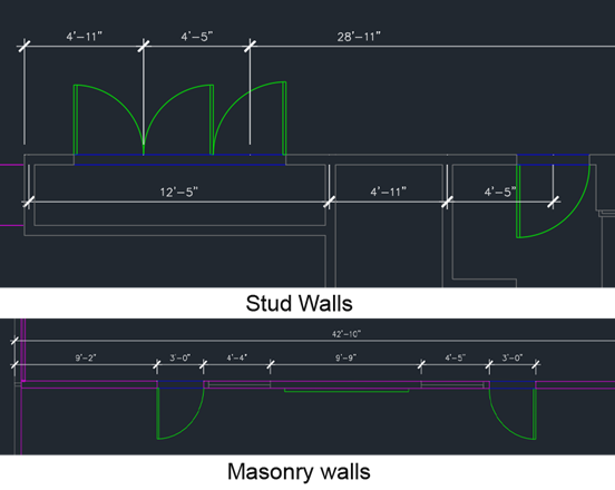 Exterior dimensions are added from the exterior face of the stud to the centre mark of openings like doors or windows. Interior dimensions are added with respect to the wall centres. we ignore the finish material thickness on the walls as it’s usually not accurate or uniform. For masonry walls, we dimension from edge to edge for the wall as well as for the openings like Doors and windows.