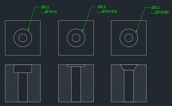 Symbols of hole features like counterbore, countersink or spotface should precede the feature diameter symbol and the depth symbol is added after feature diameter.