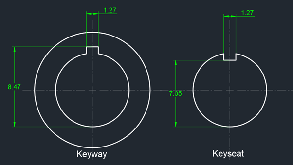 The height of the keyseat and keyway itself is not dimensioned rather it is dimensioned with respect to the shaft or hole. For keyseat, dimension is from the bottom of the keyseat to the other end of the shaft and for keyway, it is from the top of the keyway to the bottom of the hole. The width of the keyway or keyseat is added additionally.