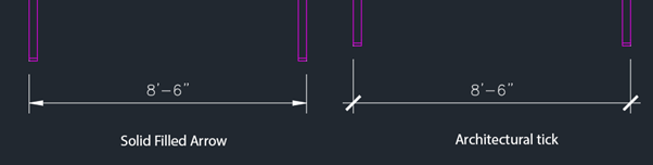 Use architectural tick as arrow style as it’s one of the most popular ones used on drawings and easily recognisable. Though there is no set standard when it comes to using arrow style and as per National Cad Standards (USA), you can use either architectural tick or even solid arrow that is popularly used in mechanical drawings.