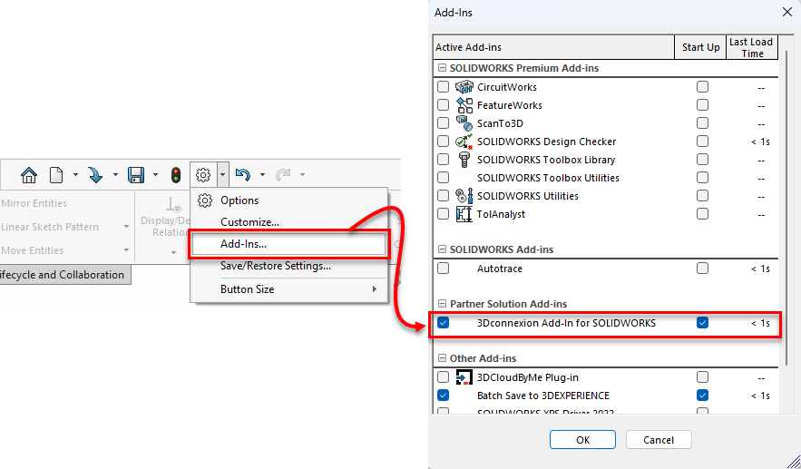 When working with a 3D mouse like the one from 3D connexion if the mouse does not work then go to โAdd-Insโ and make sure โ3D connexion add-In for Solidworksโ is checked. Make sure it’s checked at “start-up” so that you don’t need to do it every time the software starts.