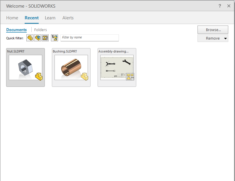 Type R key and a recent files window will show up where all the recently used Solidworks files will display. You can open any file from this list simply by clicking on it.
