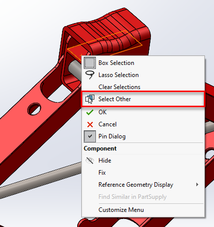 To select a feature that is hidden from view because of another component in an assembly select the mate tool then move your cursor above the object which is obscuring your view then right-click.