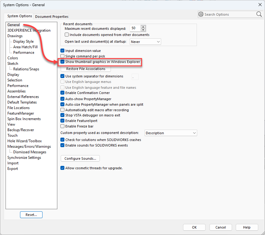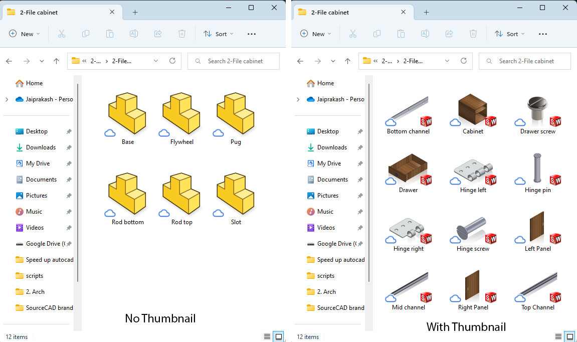 After selecting this option make sure you select โlarge iconsโ in the view option of file explorer as well and the thumbnails will show up for all the parts and assemblies.